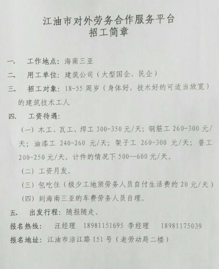 | 江油市對(duì)外勞務(wù)招工簡章 | 10 | 海南三亞 |